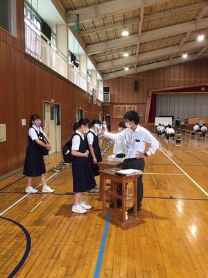 今日の午前中は3年生。午後から1年生が登校します。体育館に2クラス。広がって入りました。体育館に入る時には、熱を測ります。3カ月ぶりにチャイムが鳴り、生徒の声が聞こえる学校が復活しました!よい令和2年度の始まりです!